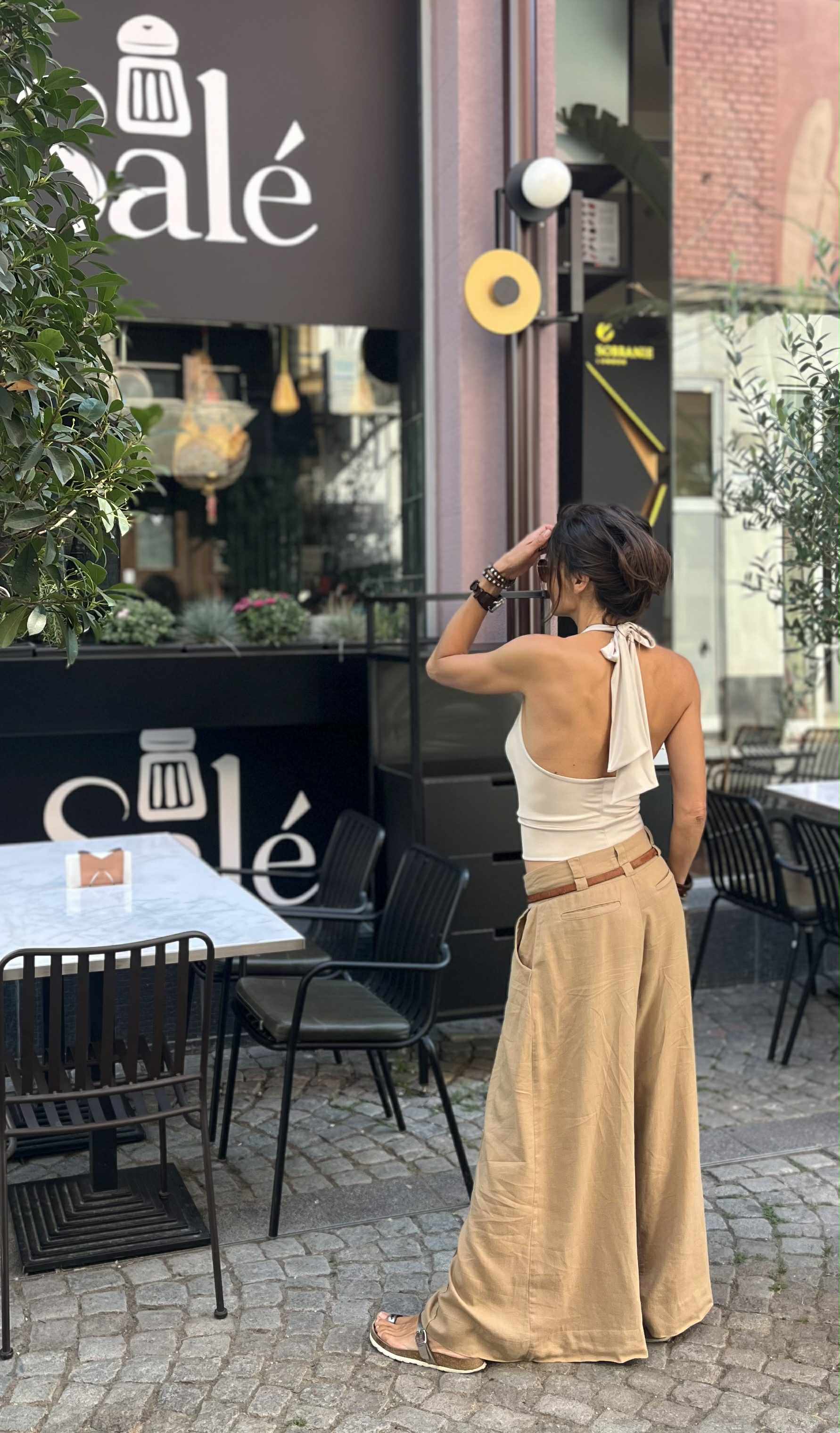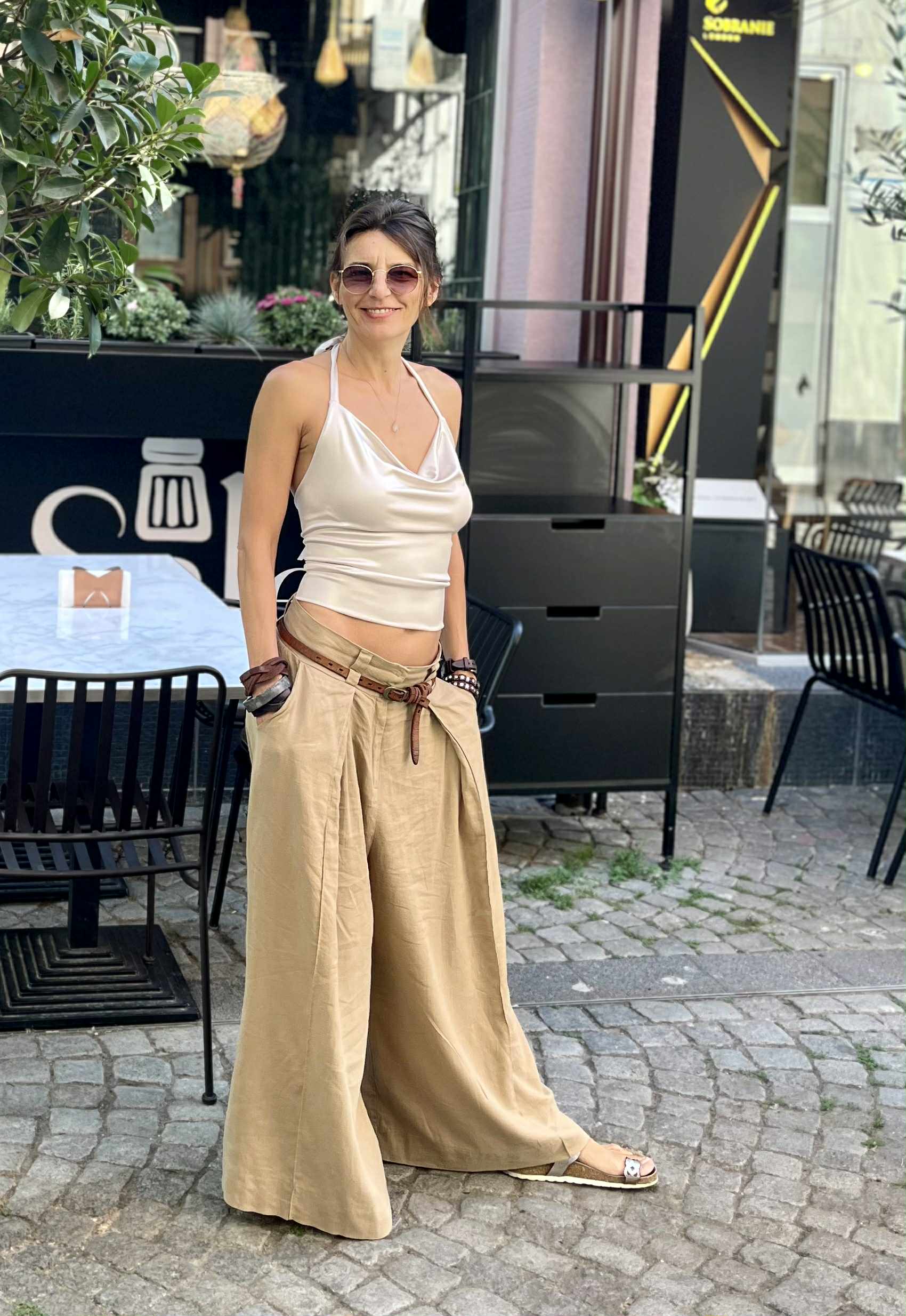 Top made of brown oil jersey and brown glitter.