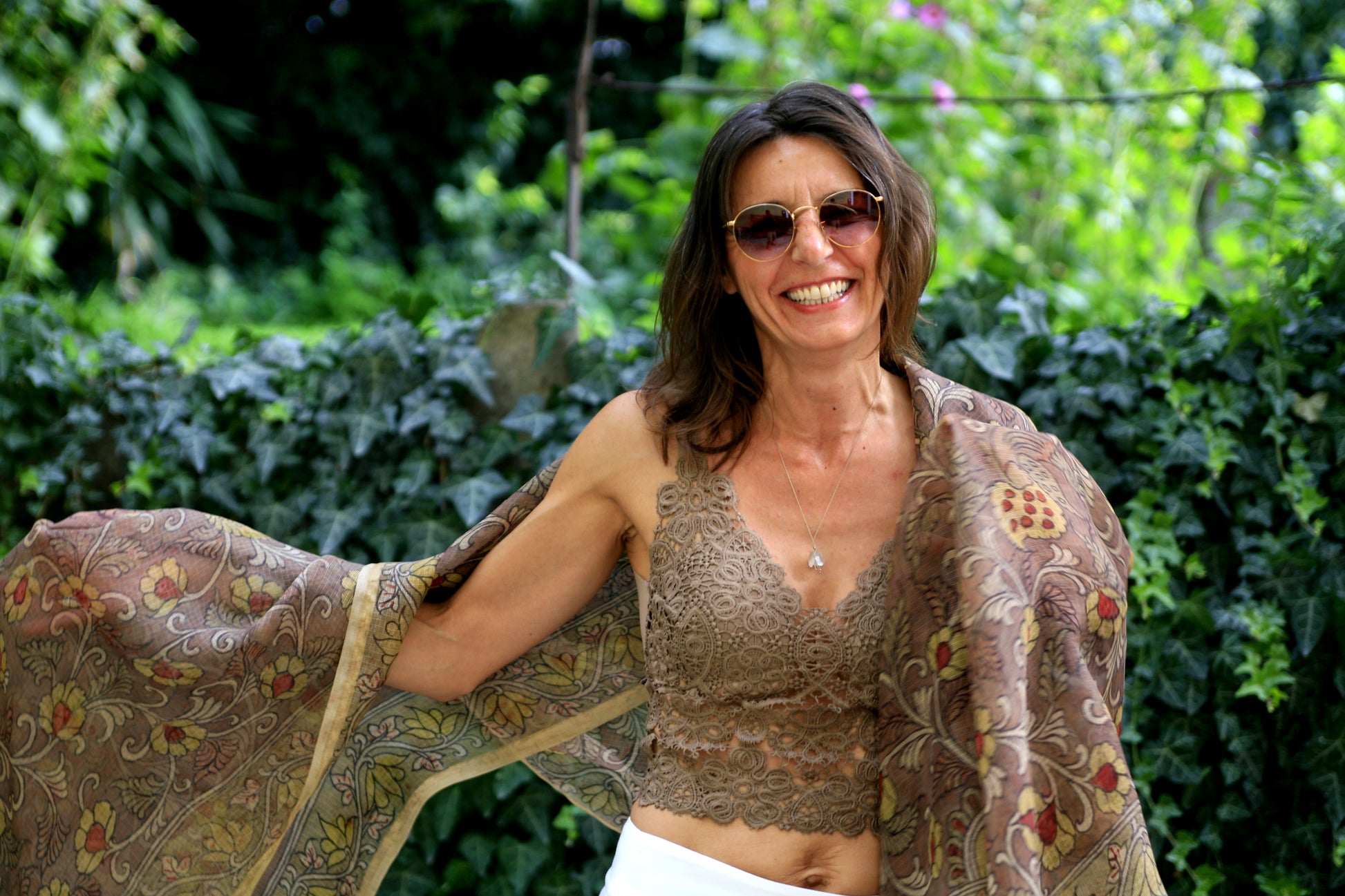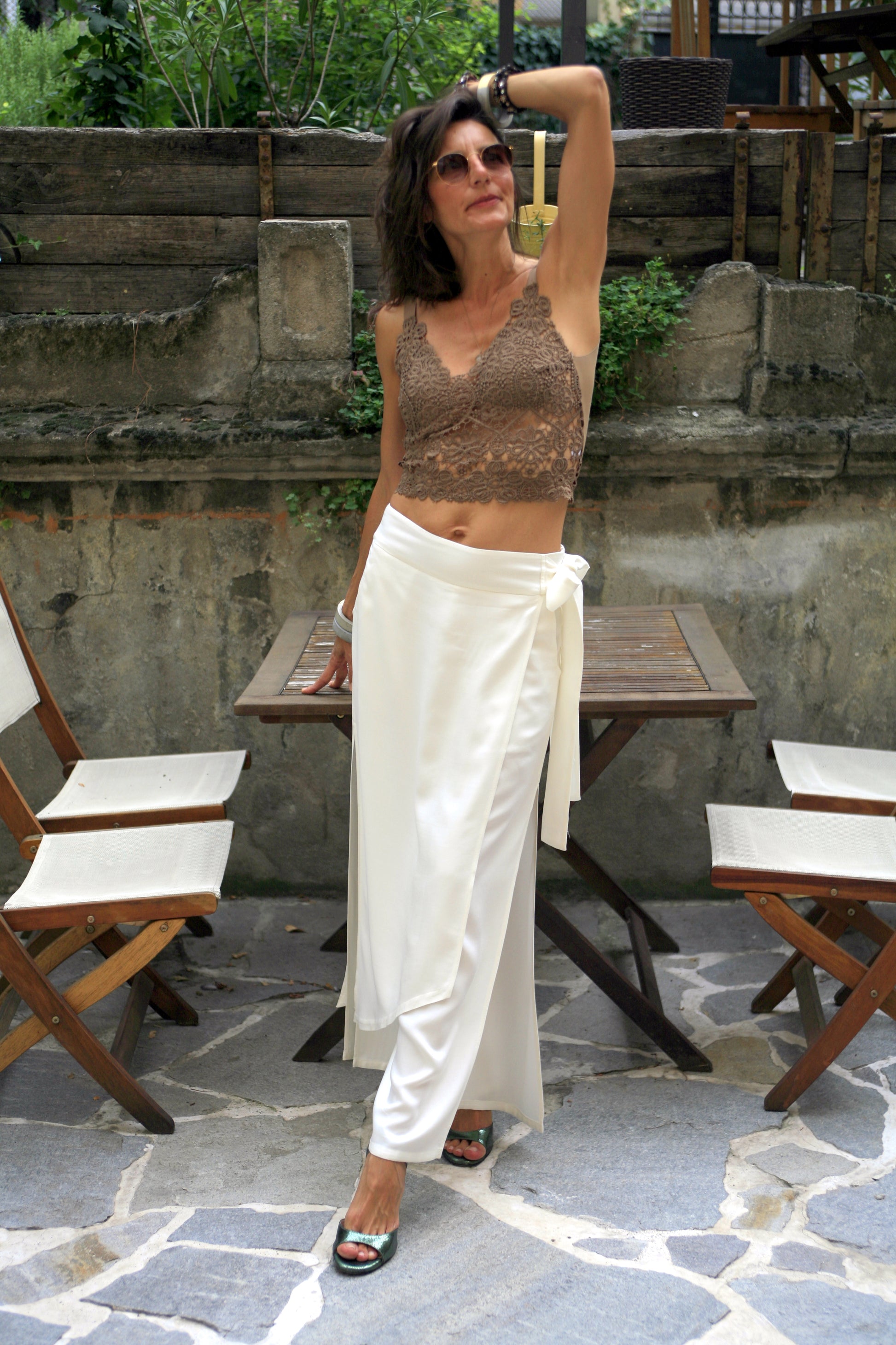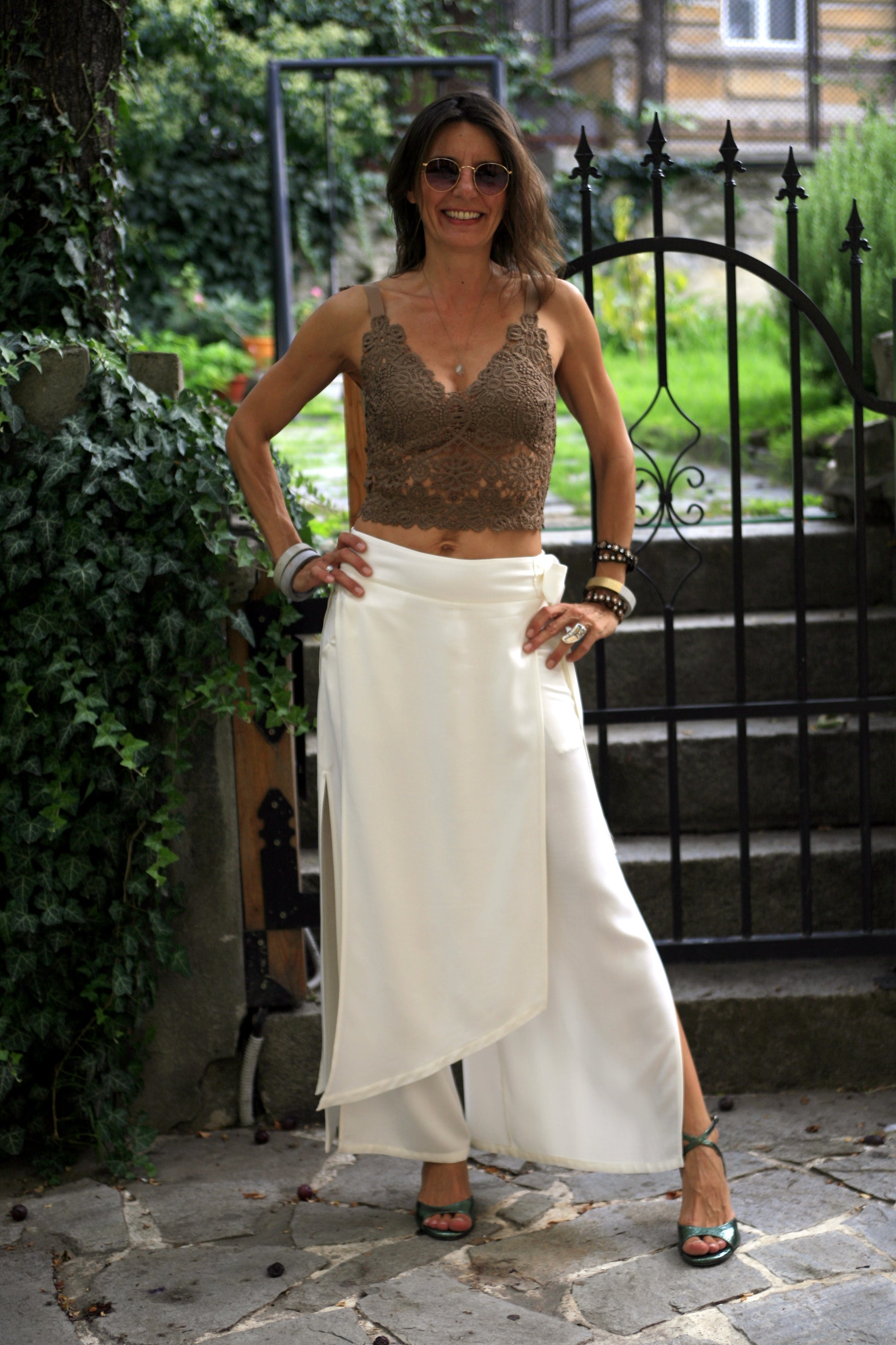 Top made of brown oil jersey and brown glitter.
